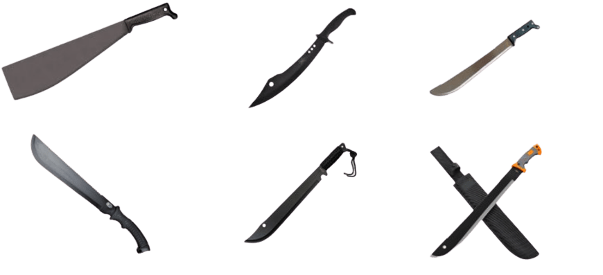 Machetes can vary in shape and size. Examples include but are not limited to the images below.