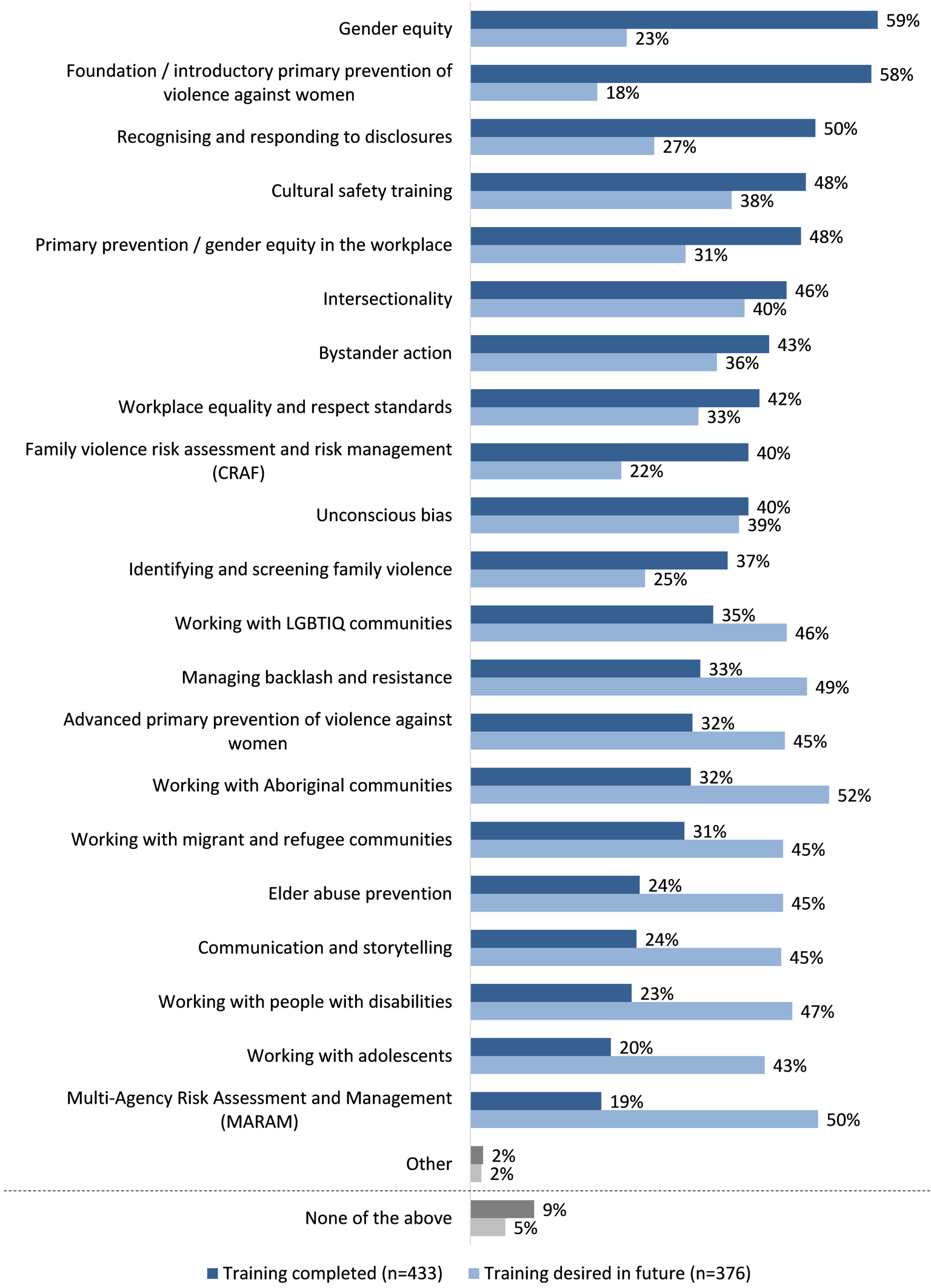 The primary prevention workforce was asked to identify both the family violence prevention and response topics they had completed training in, and those they would like further training in.