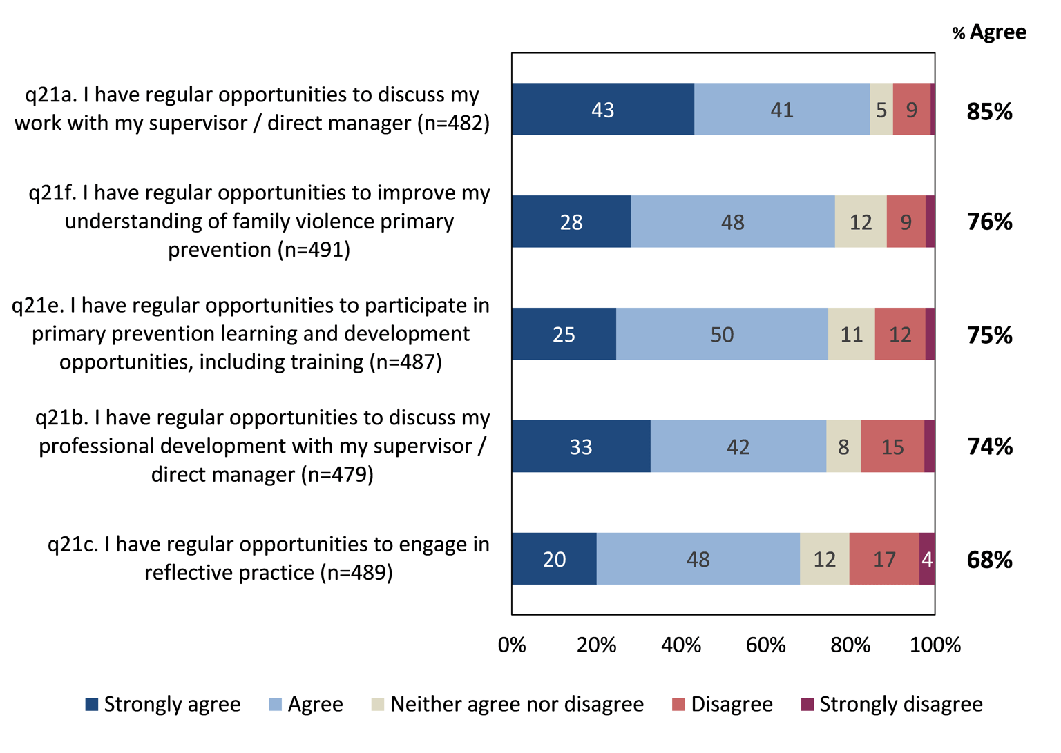 When asked about a range of more specific metrics associated with the support that their supervisors / managers had provided, 85% agreed that they had regular opportunities to discuss their work with their supervisor or direct manager. Furthermore, around three-quarters of the workforce also agreed that they have regular opportunities to improve their understanding of family violence primary prevention or upskill through participation in training or discussions regarding their personal development (74%-76%).