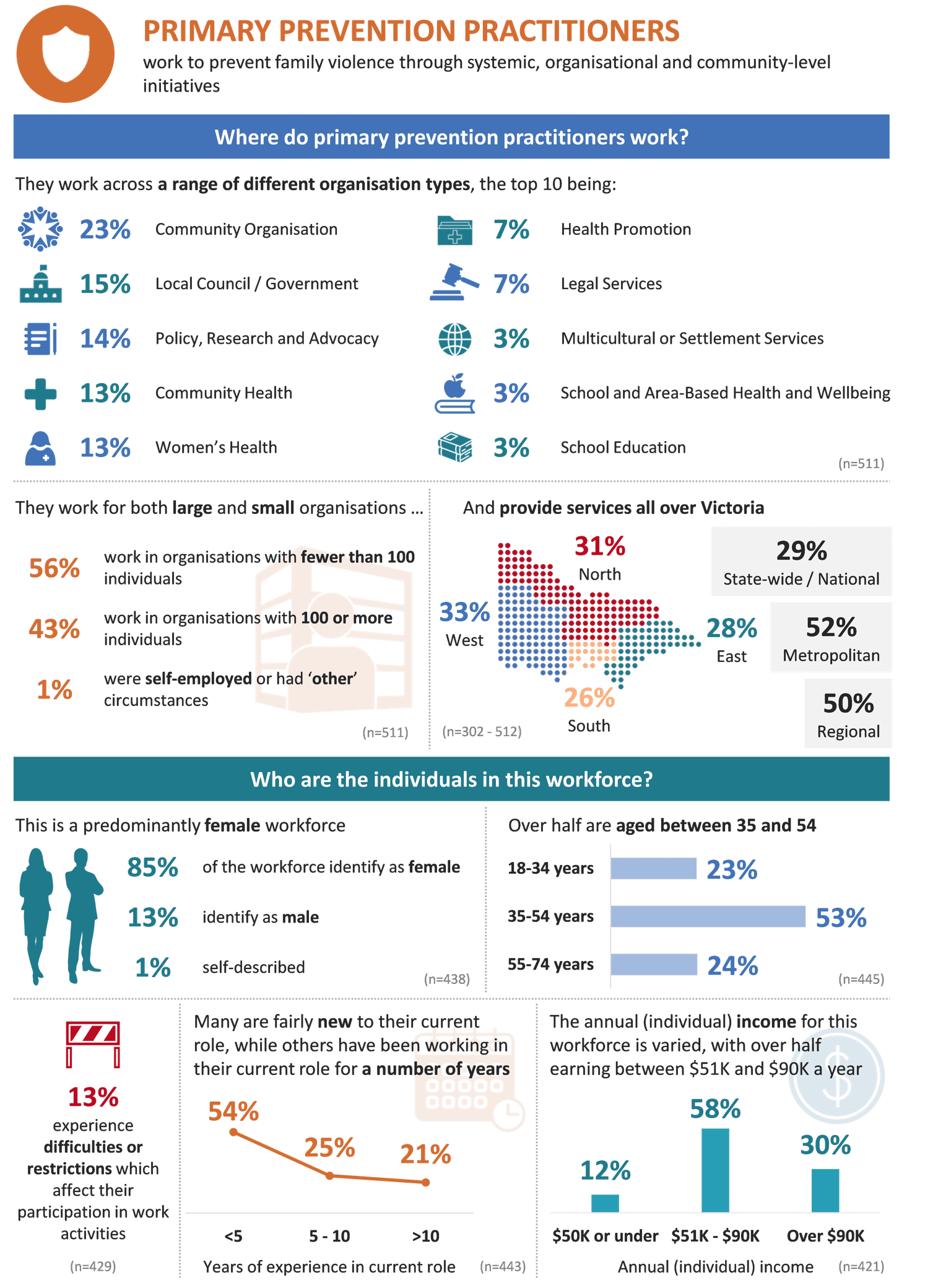 - enable a more nuanced understanding of specialist family violence and primary prevention workforces through targeted consultation, surveying and regional analyses of these workforces.