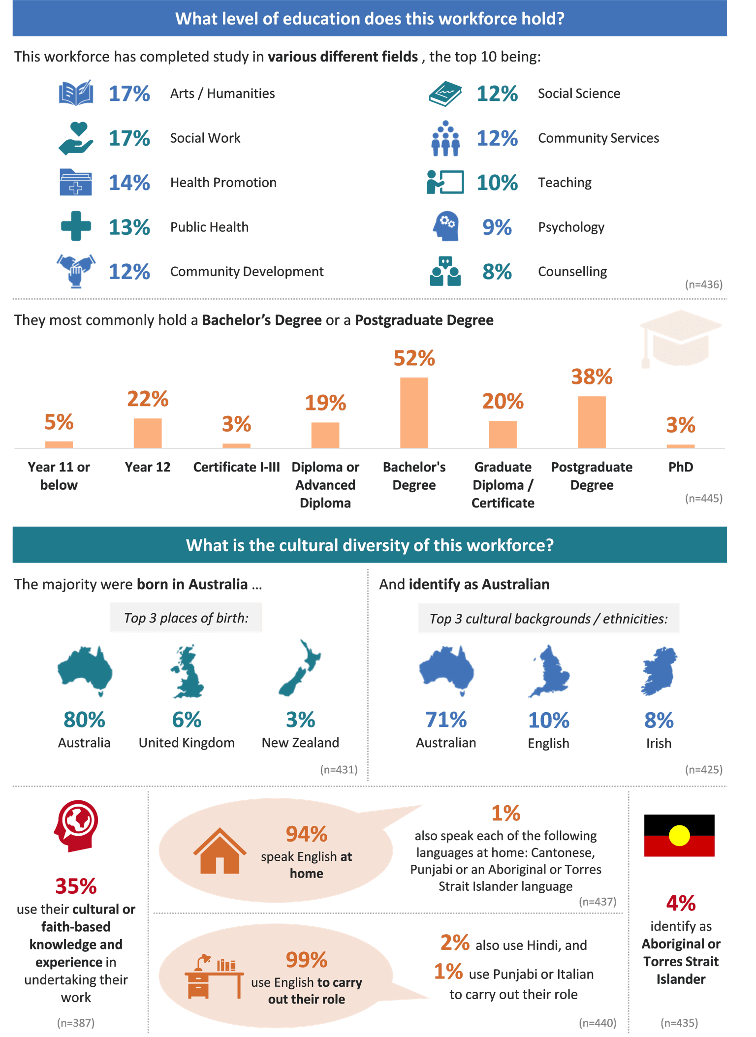- Where respondents indicated that they held paid roles across multiple workforces, the initial screening questions directed them to complete the Census in the capacity of only one of these workforces. To request the full questionnaire please email the Centre for Workforce Excellence at cwe@familysafety.vic.gov.au