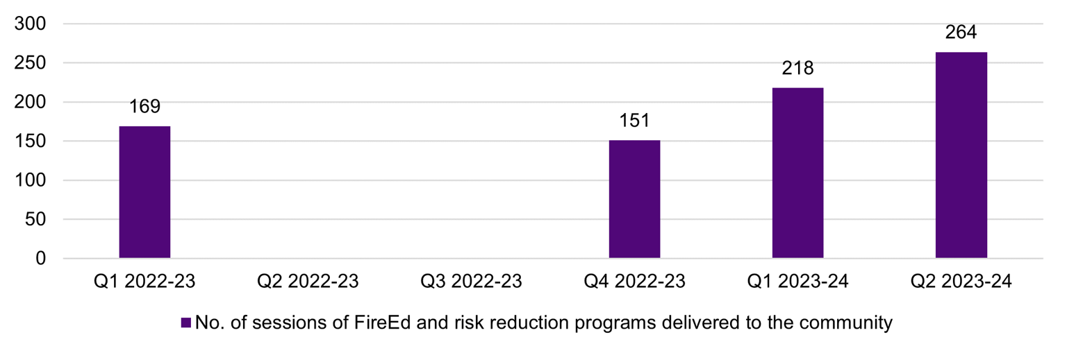 FRV delivered 264 FireEd and risk reduction programs in Q2. This is a 21.1 per cent increase compared to the previous quarter Q1 2023-24 (218) and demonstrates a notable achievement (Figure 1). FRV advised a combination of factors contributed to this result, including improvements to internal risk reduction program reporting and an increase in the delivery of risk reduction programs scheduled towards the end of the 2023 calendar year.
