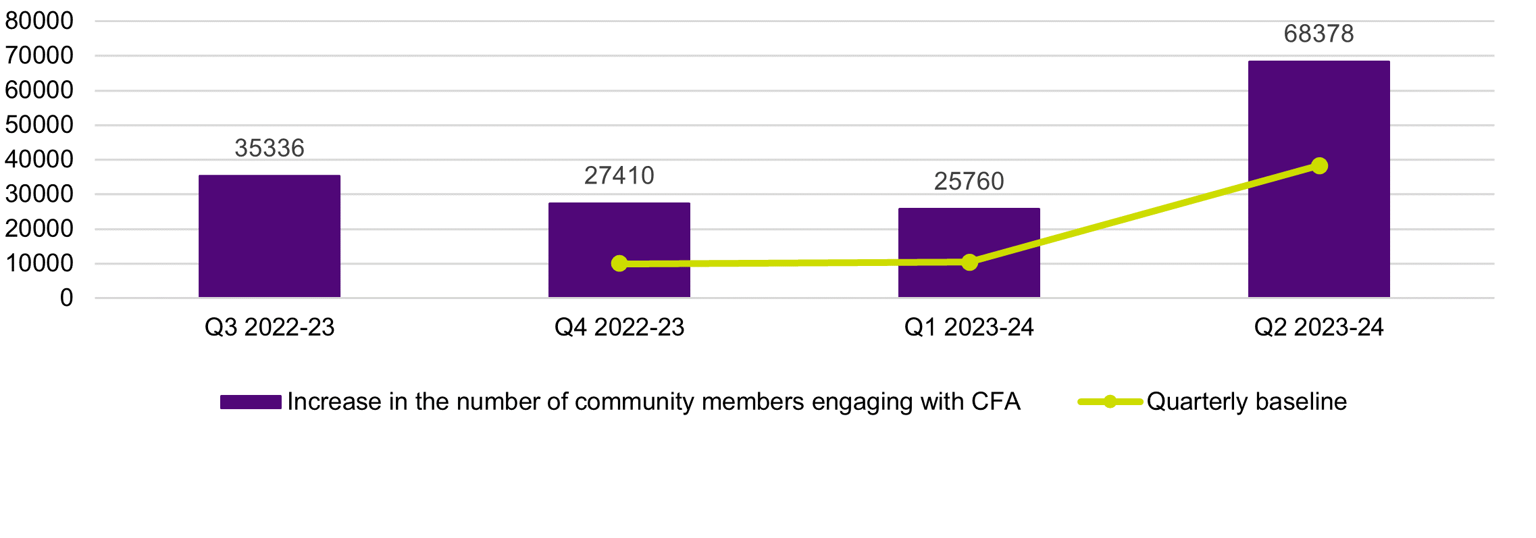 CFA reported engaging with a total of 68,378 community members in Q2. This result demonstrates a notable achievement considering the significant increase against CFA’s quarterly baseline of more than 30,000 community members engaged this quarter (Figure 2). This result includes the total number of community members engaging with the CFA through the CFA Fire Safety Essentials Program, CFA Fire Safety Planning Workshops, visits to properties in high-fire risk areas, CFA representation at community events, CFA care-sector engagement and CFA school education and fire drill programs. CFA also attributes this higher level of engagement partly to CFA Brigade engagement activities returning to pre-COVID levels, such as through CFA Open Days.