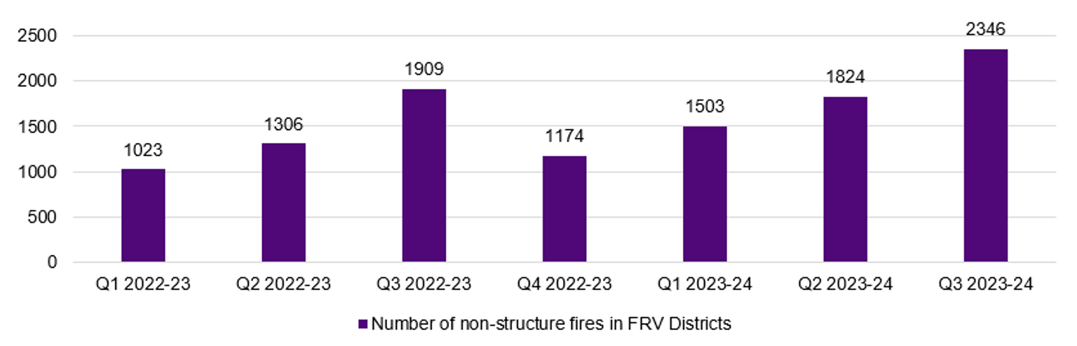 FRV reported 2346 non-structure fire incidents this quarter compared to 1824 in Q2, which is an increase of 522 incidents (Figure 8). FRV report that this is consistent with seasonal variability. FRV note that these incidents are attributed to grass and scrub fires in regional areas as well as bin/dumpster fires and passenger vehicle fires in non-regional areas.
