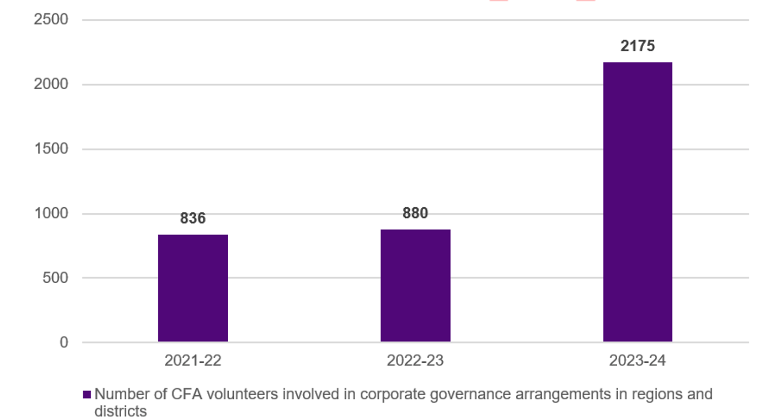 In 2023-24, 2,175 CFA volunteers were involved in corporate governance arrangements in regions and districts. This is an increase of 154 per cent against the two-year baseline of 858. CFA attribute this increase to factors such as improvements in data capture, focussed development of committees and broader engagement of volunteers due to an expected higher level of seasonal risk.