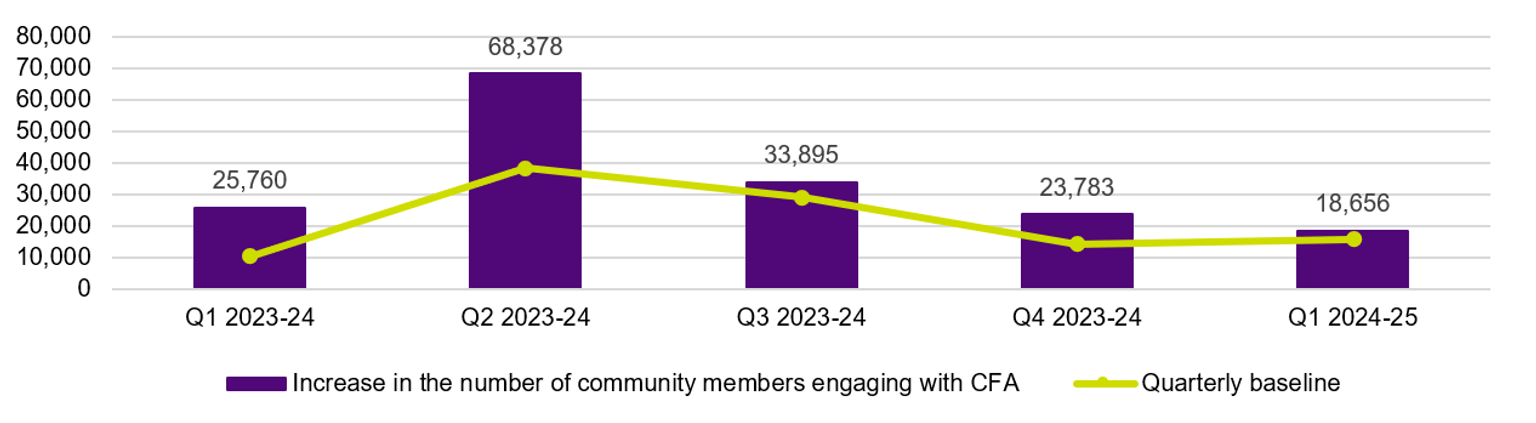 CFA has consistently exceeded the baseline for the number of community members it engages each quarter. This quarter’s result exceeds the baseline by 17 per cent (Figure 1 below).
