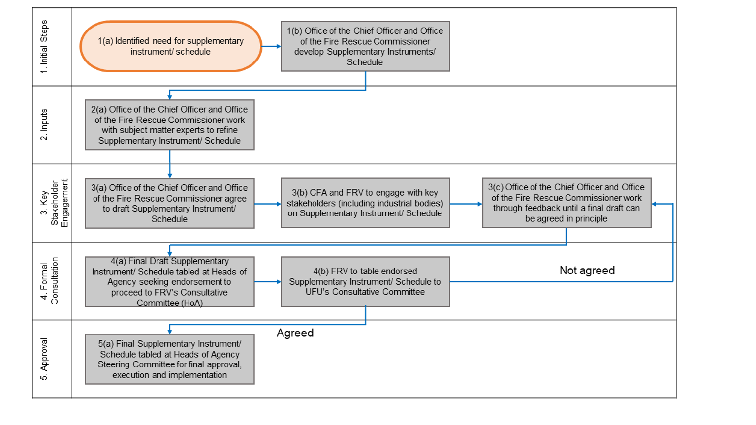 For example, CFA and FRV continue to discuss supplementary instruments relating to performance and misconduct management, leave, vacancy and relief management. CFA and FRV developed a draft and agreed-in-principle position for each of these instruments, and FRV proceeded to informally consult with the UFU.