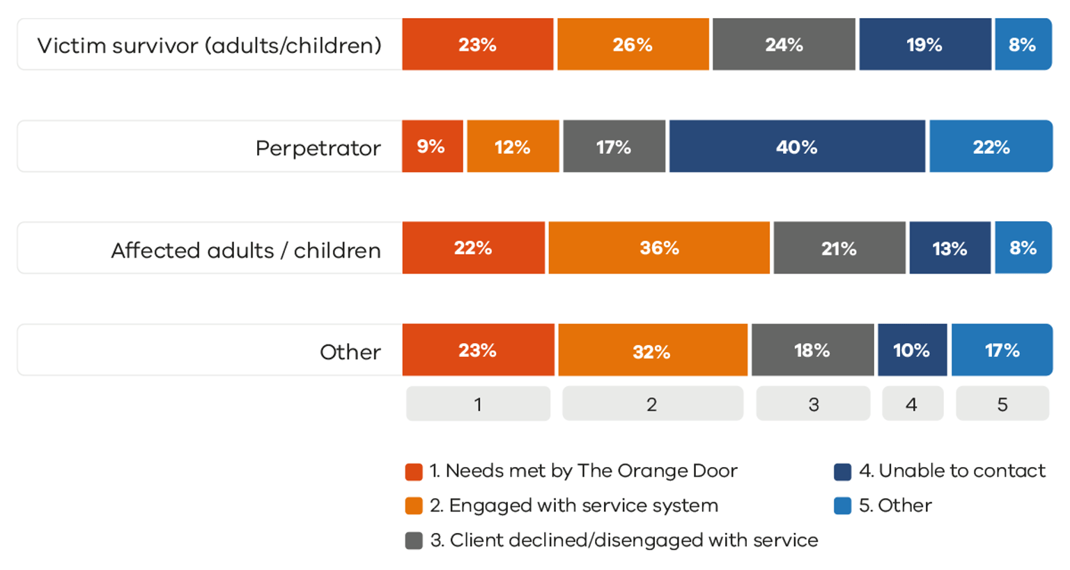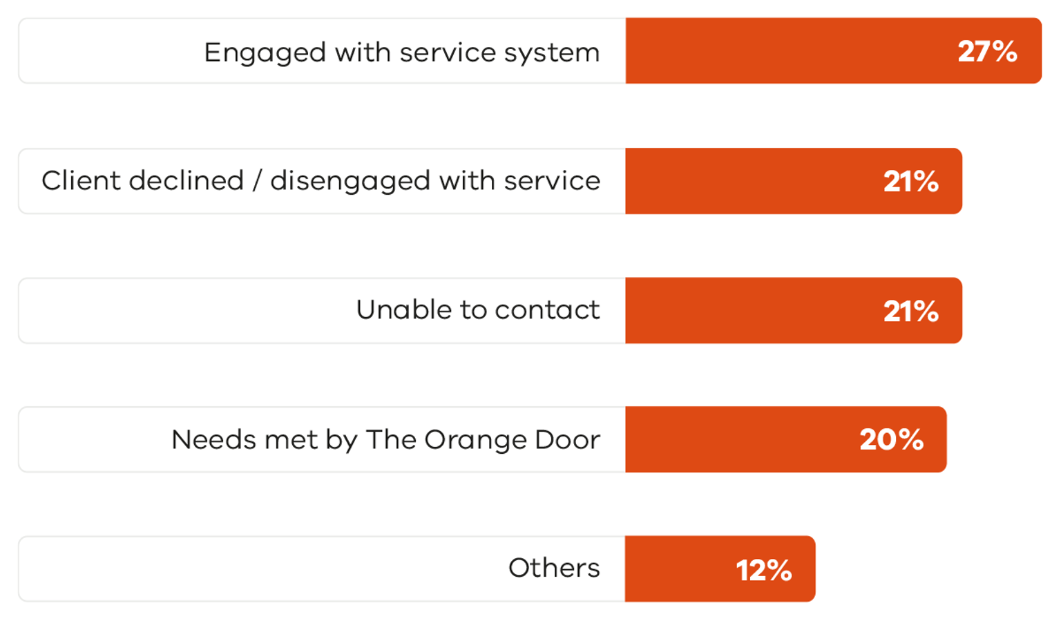 In 26.8% of cases clients required further support, and The Orange Door network connected them to a service to meet their additional needs such as housing, mental health and alcohol and other drug services. This indicates that for almost half of cases (46.5%), The Orange Door network met the needs of clients or connected them with a further service for additional supports. The Orange Door network was unable to contact the person referred in 20.7% of cases, and in a further 21.0% of cases the person chose not to take up the service offering.[24]