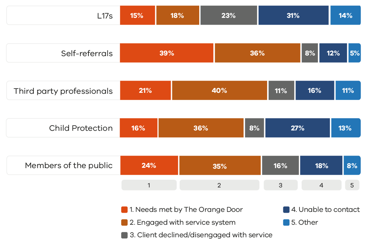 When comparing case closure reasons across different referral types, people were more likely to have their ‘needs met’ by The Orange Door were those that were a result of a self-referral (39.3%) compared to those that were referred via an L17 referral (14.7%) (Figure 18).[25] With a self-referral, the person is ready for support and actively seeking help, compared to other referral types. A significant proportion of cases closed due to ‘being unable to be contacted’ were from an L17 referral (30.5%).