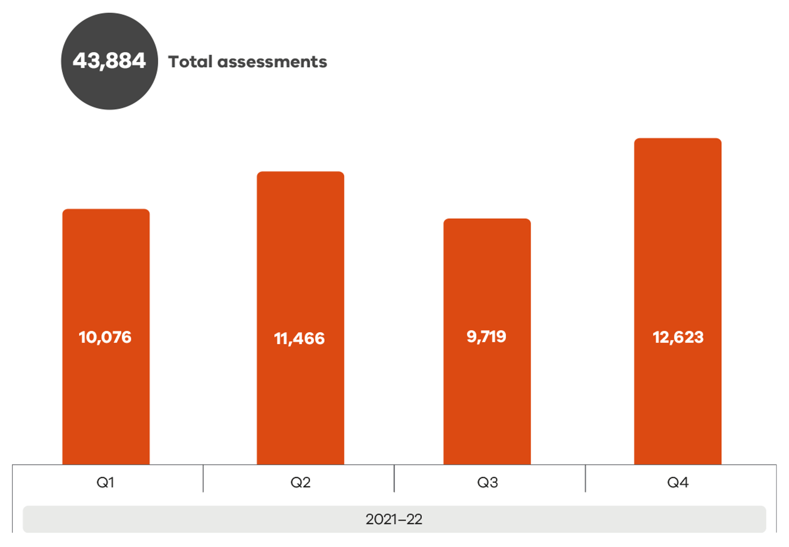 The number of assessments undertaken by practitioners increased by 102.6%, compared to 2020-21. While the increase in risk assessments is mostly due to the commencement of the seven new The Orange Door areas in 2021-22, as well as the first complete year of operations for three others, five initial The Orange Door areas also showed an increase of 12.4%.