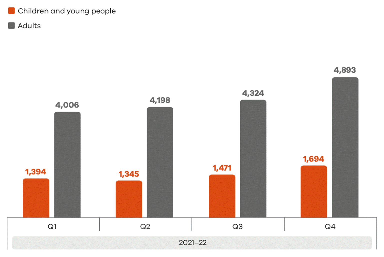 In 2021-22, practitioners undertook more than 23,000 family violence risk assessments.[18] Of these, more than 17,000 assessments were undertaken for adults and nearly 6,000 were undertaken for children and young people (Figure 11).