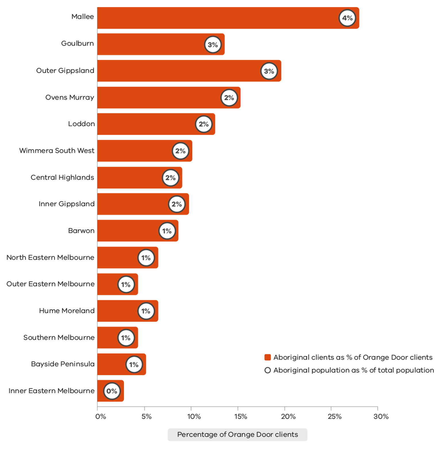 Aboriginal people remain significantly impacted and over-represented among The Orange Door network’s client base, highlighting the strong need for culturally safe and appropriate responses tailored for this community. To expand accessibility for Aboriginal people, at the time of writing Aboriginal Access Points were planned to be established in Bayside Peninsula and Barwon to provide an additional option for Aboriginal people to access services and support.