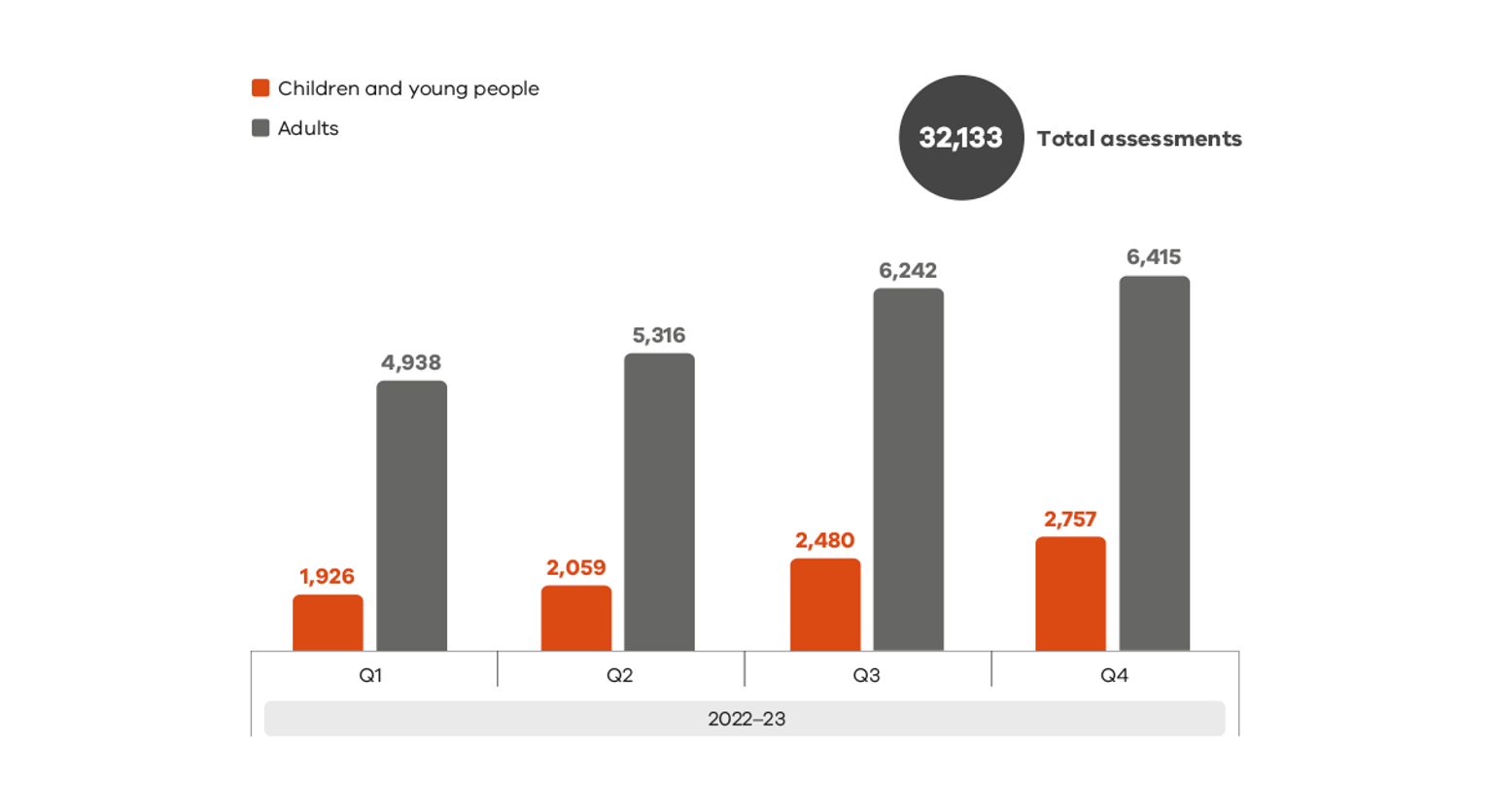 In 2022-23, practitioners undertook over 32,000 family violence risk assessments.[2] Of these, almost 23,000 assessments were undertaken for adult victim survivors and over 9,000 were undertaken for children and young people experiencing family violence (Figure 9).