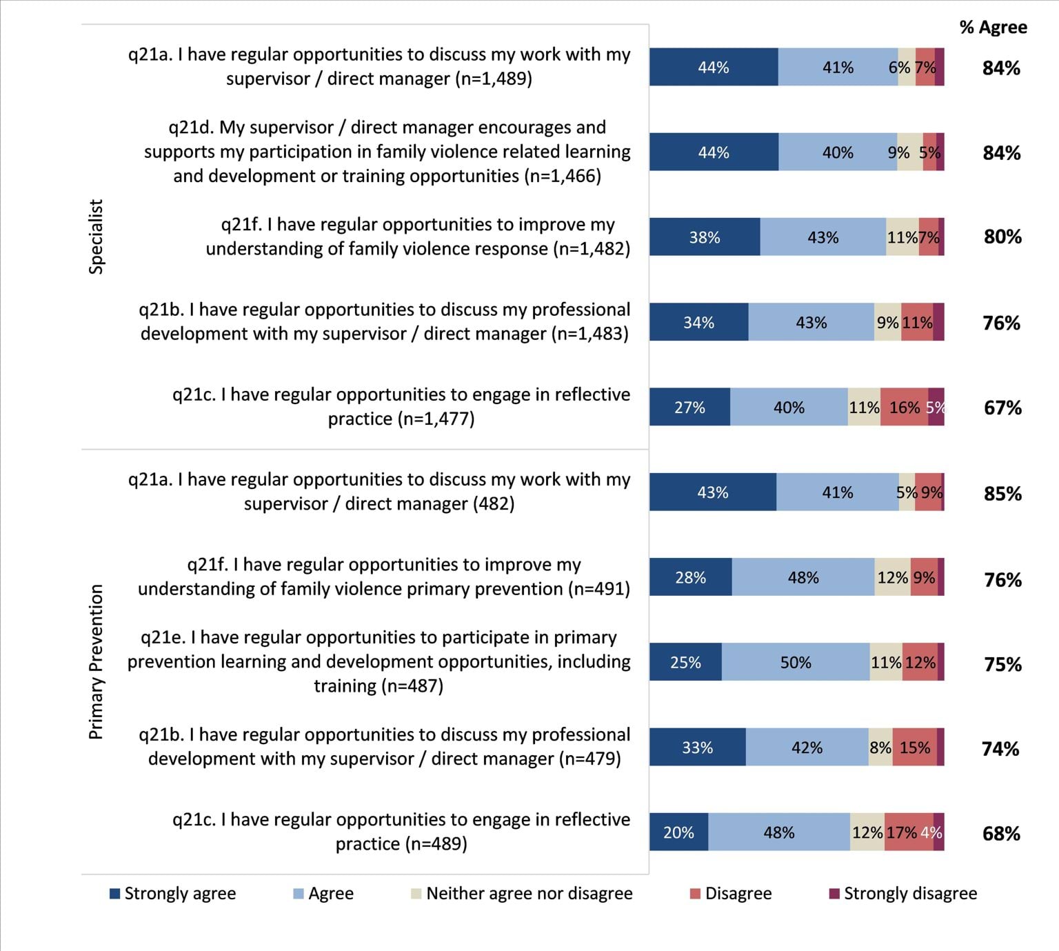 This chapter explores the extent to which the specialist and primary prevention workforces felt supported in the workplace, and the nature of their interactions with supervisors or managers.