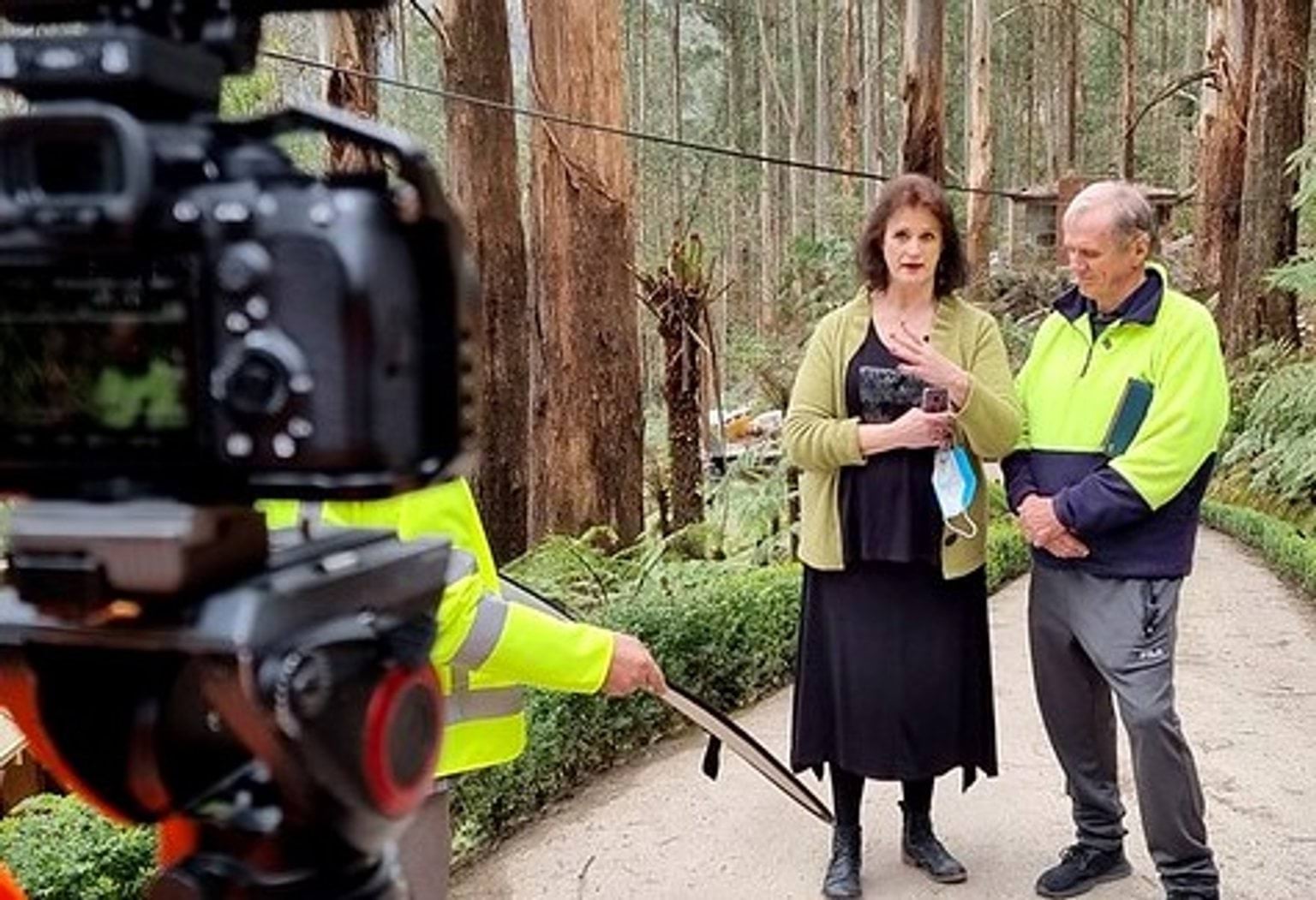 Pictured: Shane and Diana, managers of the Lake Jubilee Holiday Park talking to our film crew about their experience during the storm.