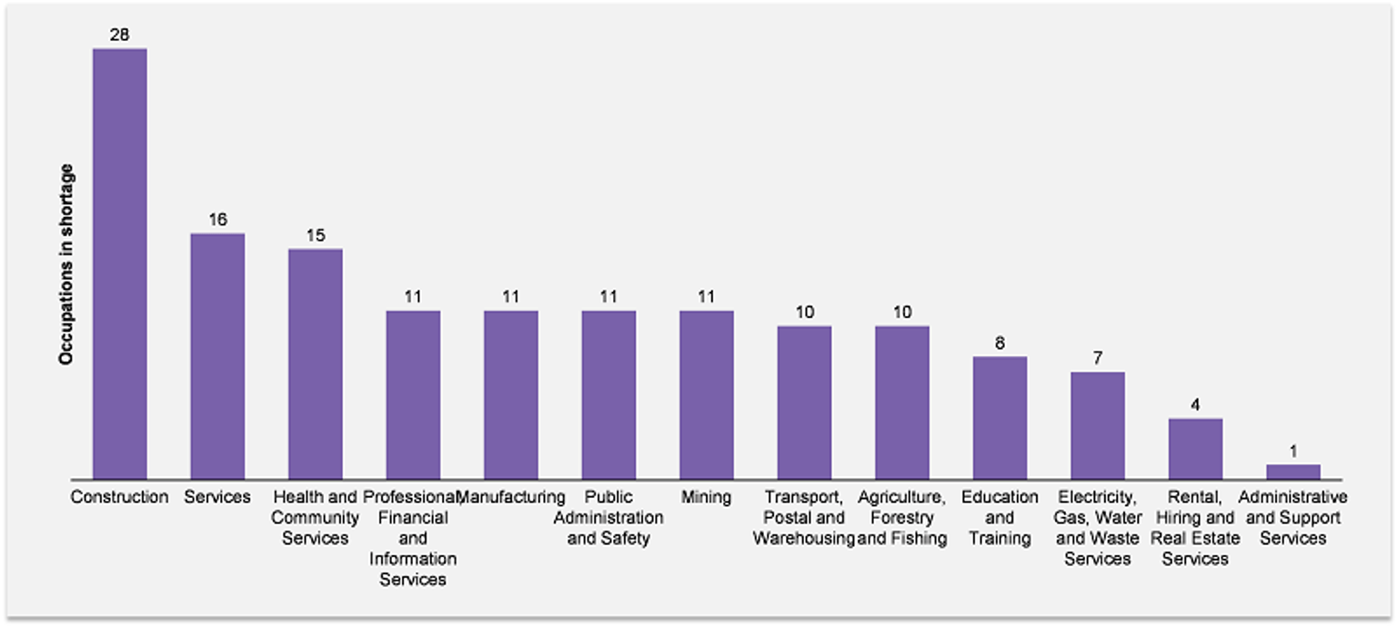In Victoria, the construction industry is experiencing the highest number of shortages, which includes electricians, landscapers and plumbers, followed by the services industry, which is requiring, among others, more bar staff, hotel and motel managers, and retail attendants (refer Figure 7). The health and community services industry is also facing widespread shortages, with aged and disabled carers, general practitioners (particularly in regional and remote areas), and social workers among approximately 15 unique occupations desperately needed to meet current demand. There are many other occupations that work across multiple industries that are in shortage, such as software and applications programmers.