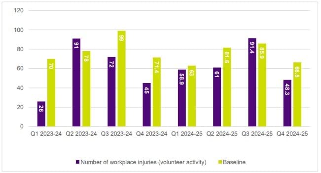 FRV reported a decline in the time lost to injury in Q4 2024–25, which is the third consecutive quarter this trend has been reported. The Q4 result of 14.44 per 1,000 FTE of one or more working days/shifts lost, is an improvement of 30.9% on the Q3 result of 20.9. FRV advised a clear causal factor behind this trend has not been identified.