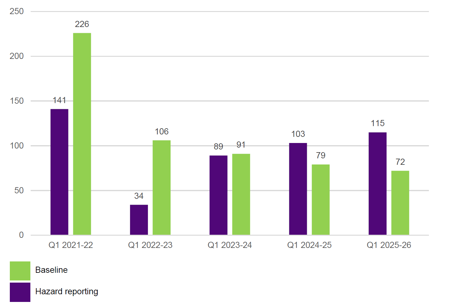 CFA reported a result of 115 in hazard reporting for Q1 2025–26, which is an increase of 59.72% against the baseline. The result for this quarter is also an 11.66% increase on Q1 2024–25. CFA advised the Q1 2025–26 result can be partly attributed to Section 29 annual inspections, which commenced in July 2025.