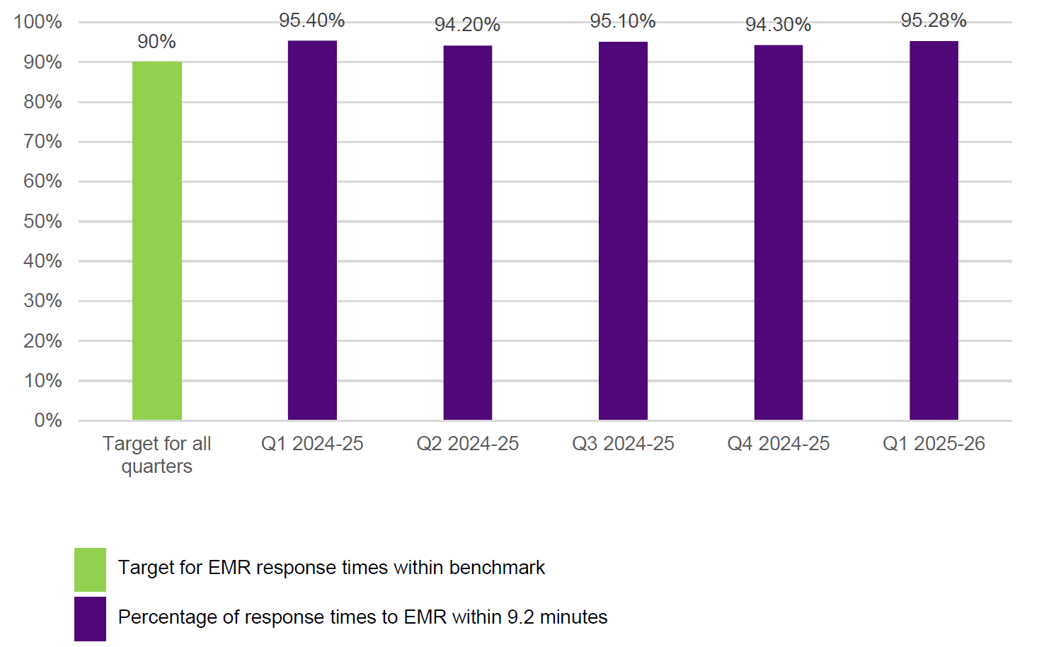 FRV reported a 95.28% response time to EMR within the target benchmark of 9.2 minutes for Q1 2025–26. FRV has consistently exceeded the target benchmark of 90% since this measure was first reported on in 2020–21.