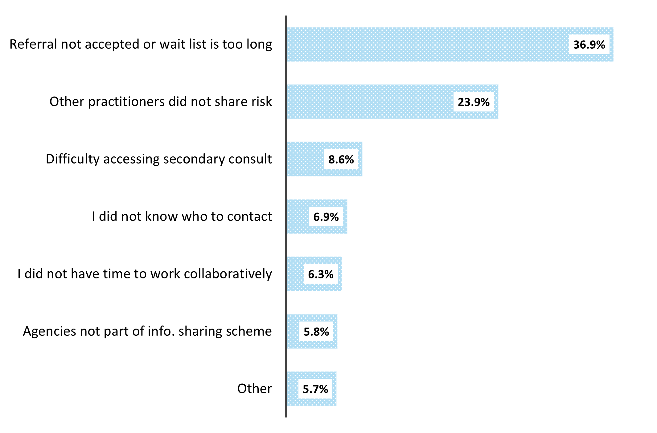 More than a third of participants stated that long waiting lists and referrals being rejected are barriers to collaboration with other agencies. Figure 2 sets this out.