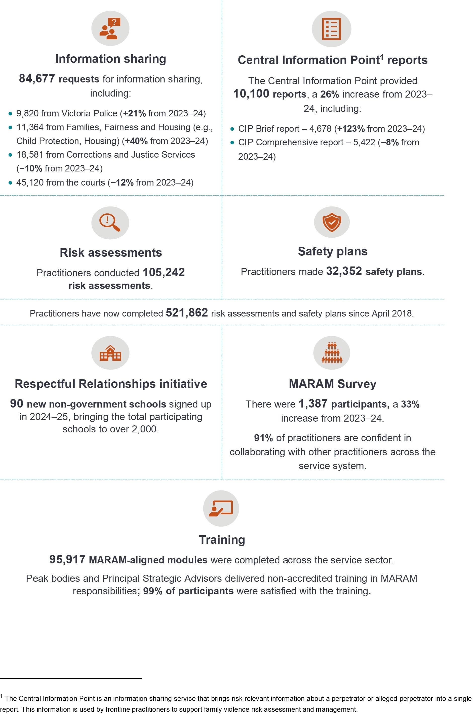 - 95,917 MARAM training modules were completed, reflecting strong sector engagement and ongoing commitment to building workforce capability in family violence risk assessment and management.