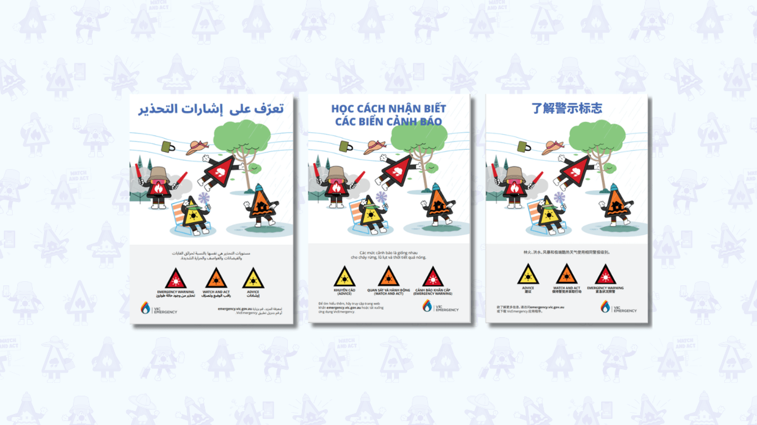 Information about using the VicEmergency app and understanding the Australian Warning System translated into Dari, Simplified Chinese, Traditional Chinese, and Vietnamese.