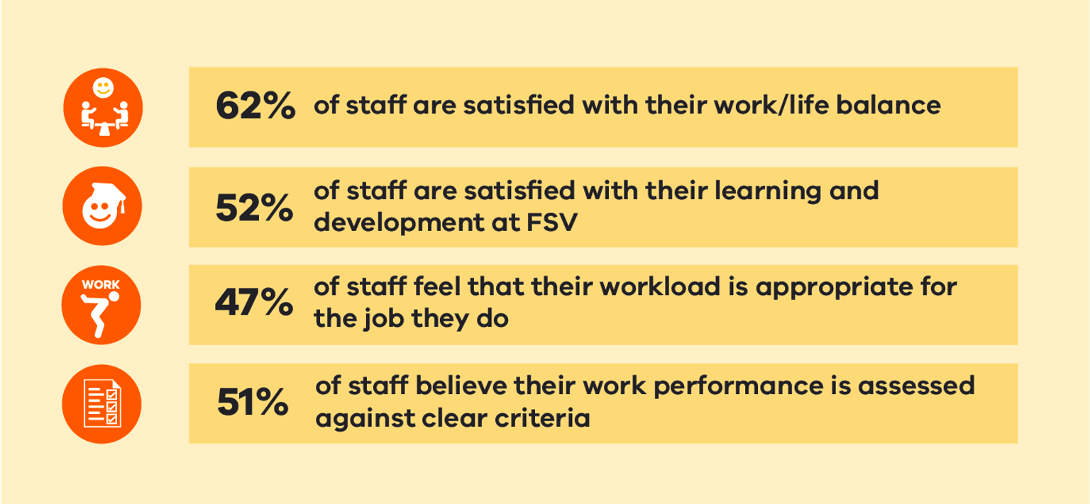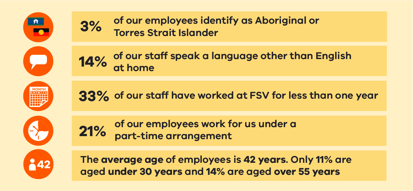 Family Safety Victoria’s operational and workforce management systems and our People and Culture Strategy, align with the strategic and corporate directions of the Department of Families Fairness and Housing, ensuring that a systematic and consistent approach is taken to improving our employees’ experiences. It is also informed by the annual results of the People Matter survey. Notwithstanding this, the People and Culture Strategy is informed by and tailored to the specific needs and aspirations of the Family Safety Victoria workforce.
