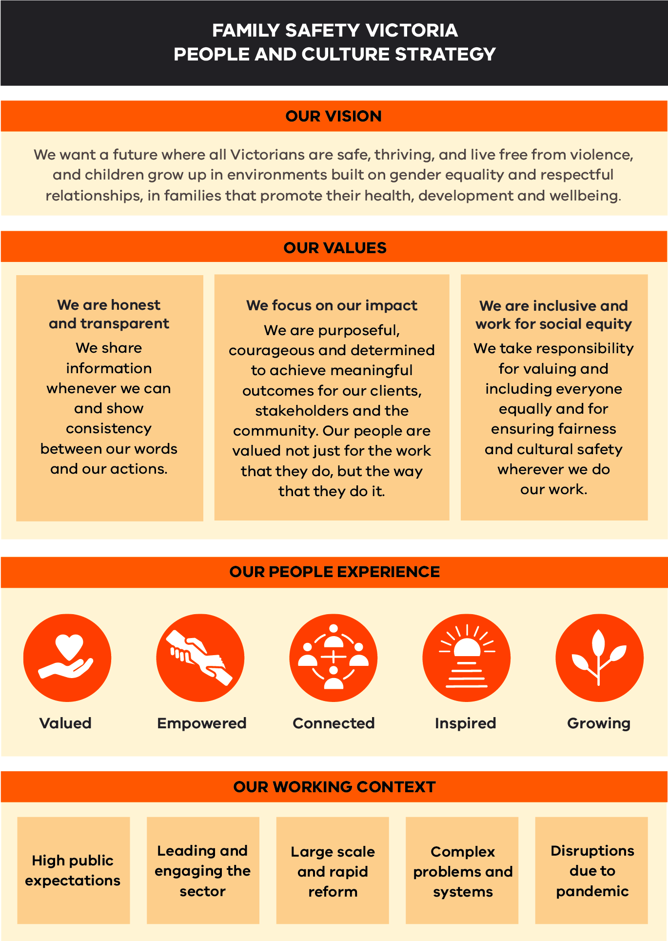 The pace of the establishment of Family Safety Victoria, the pressure to establish foundations for system change and to rapidly deliver reform, together with the disruptions caused by the coronavirus (COVID-19) pandemic, have meant that up until now our organisation has had limited time and space to look inward. The People and Culture Strategy offers the first opportunity for Family Safety Victoria to consolidate and set a positive and affirming direction forward for investment in our workforce.