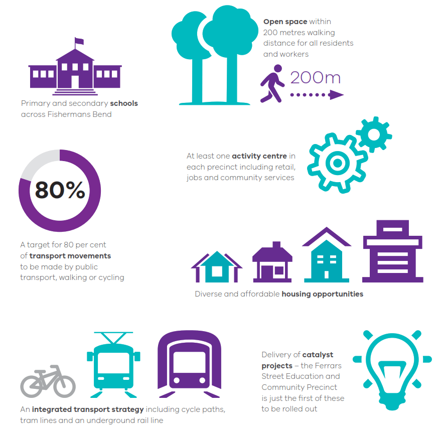 In addition to setting renewal benchmarks and sustainability objectives for the renewal of Fishermans Bend as a whole, the Vision also establishes clear direction and a distinct character for the redevelopment of each of Fishermans Bend’s five precincts: