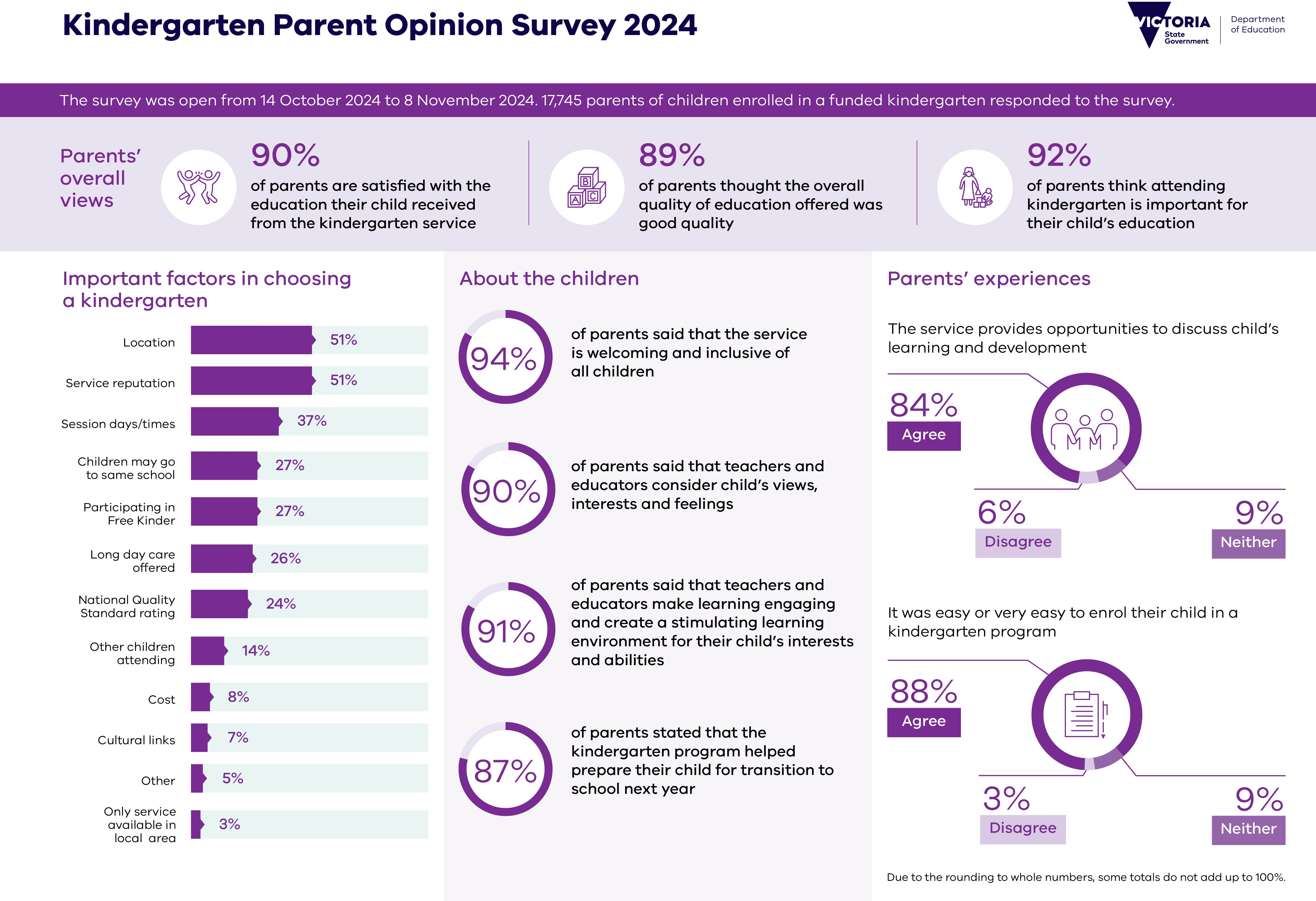 Each year, parents and carers with children in a funded kindergarten or Pre-Prep program are invited to give their feedback. They can share how they feel about their child’s kindergarten or Pre-Prep program.