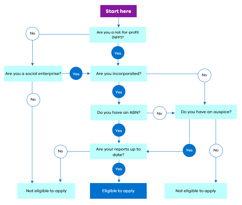 If you are an unincorporated association or community organisation without an ABN, you can apply using an auspice. See the Auspice applications on page 13 for more information.