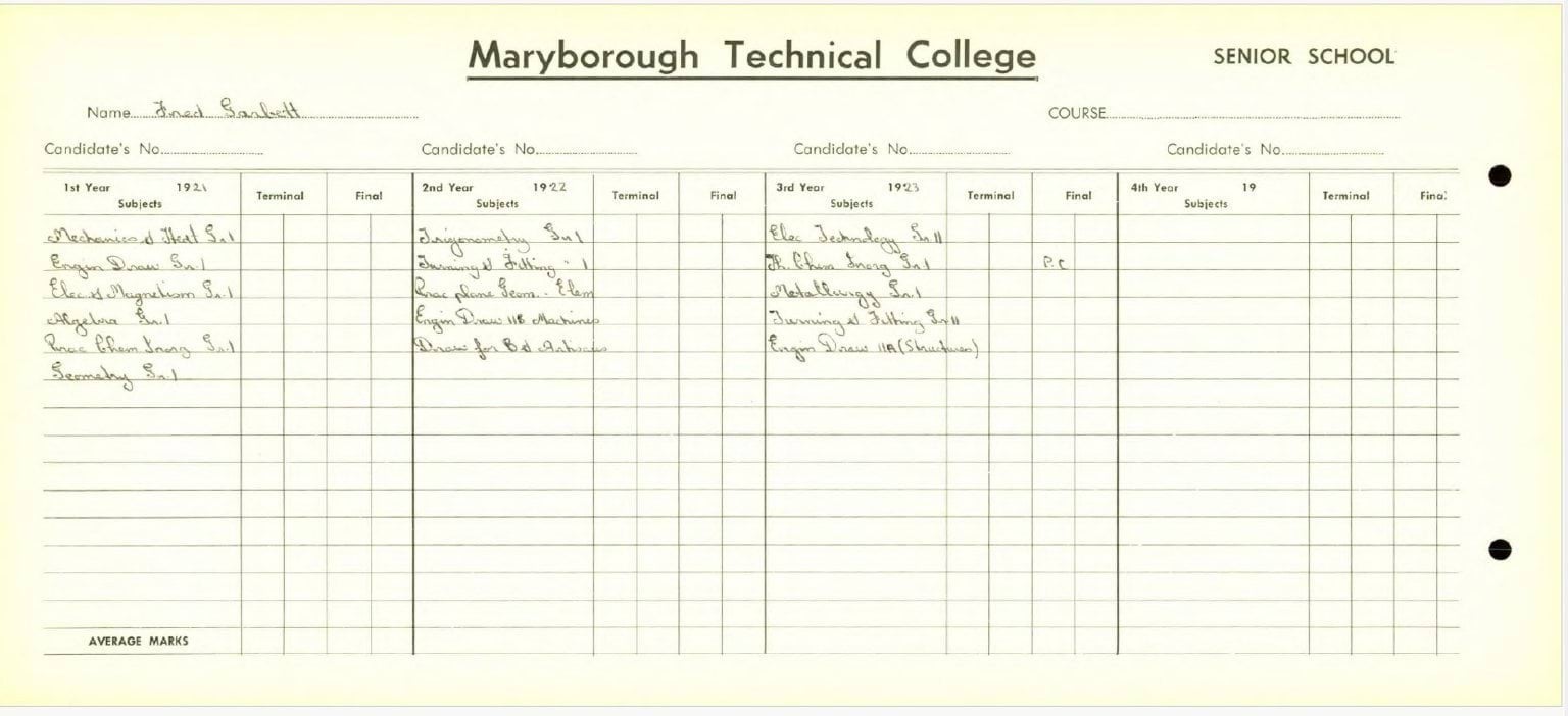 Maryborough Technical College enrolment card 1921