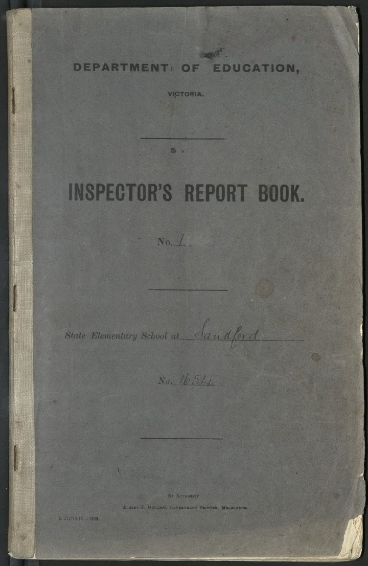Sanford Primary School Inspector's Report Book Cover 1914 to 1925