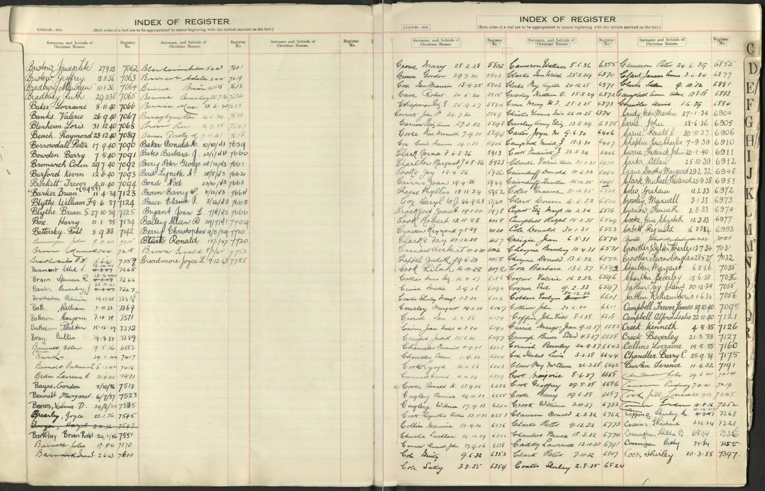 Page of the Camberwell Primary School Pupil Register 1925-1949
