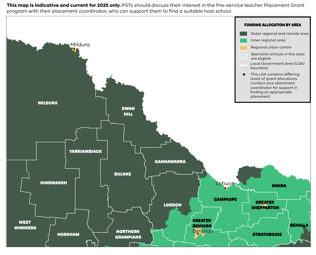 These maps are indicative for 2025 only. PSTs should discuss their intent to participate in the Pre-service teacher Placement Grant program with their placement coordinator who can support them to find a suitable host school.