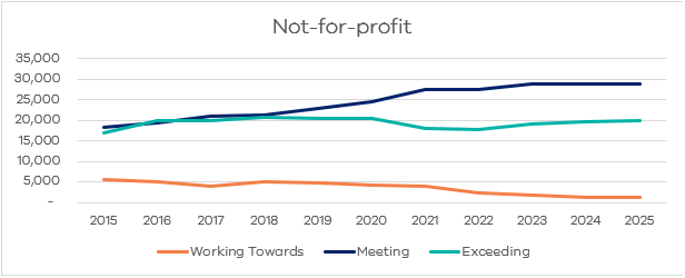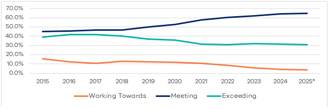 In more recent years, the trend in quality improvement has changed. While more of the system meets the National Quality Standard and fewer services are working towards the National Quality Standard, the proportion of the system that exceeds the National Quality Standard has fallen. This is illustrated in Figure A2.2 below.