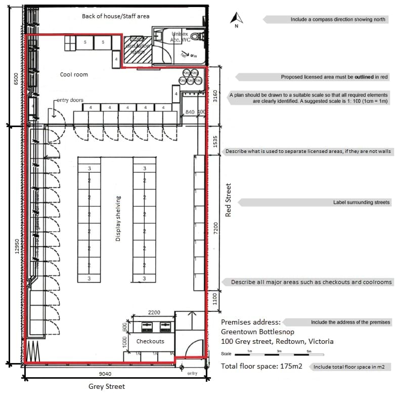 - outline the licensed area in a continuous red line – if drawing by hand, use pen or ink (not pencil or highlighter)
