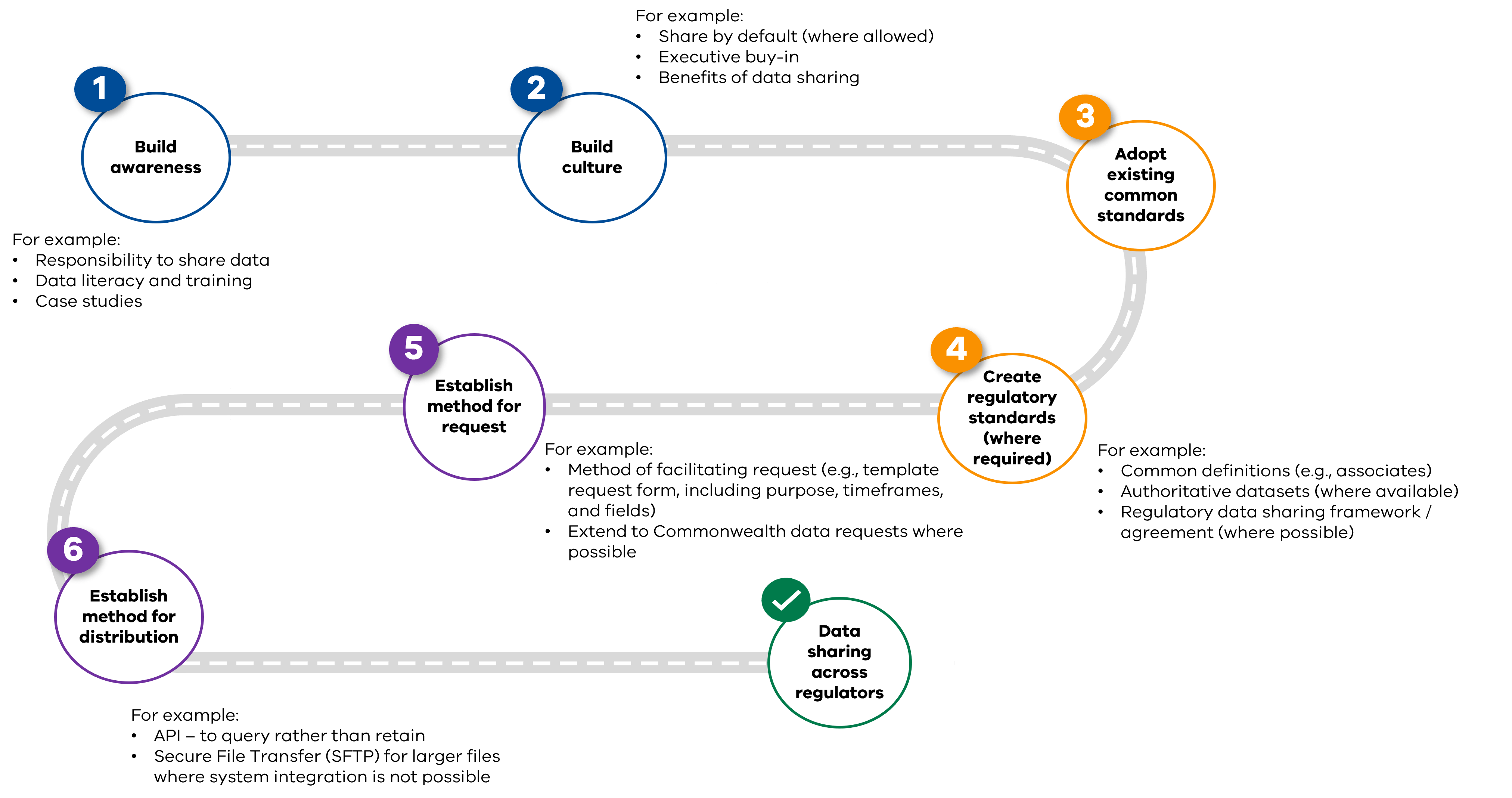 The roadmap below outlines these steps and provides some examples of activities or outcomes for each step. Although this is presented as a linear roadmap, some of the steps may occur in parallel or be repeated over time to continue to improve data sharing.