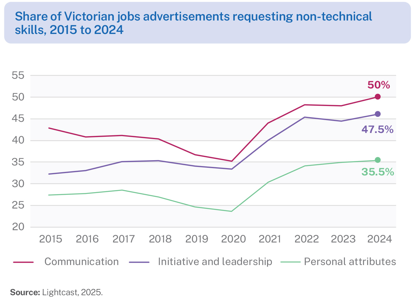 - The share of job advertisements requiring non-technical skills has been trending up since 2020. Around 73% of job advertisements require applicants to have at least one of the 3 non-technical skills shown on the right, with communication, and initiative and leadership skills most in demand.