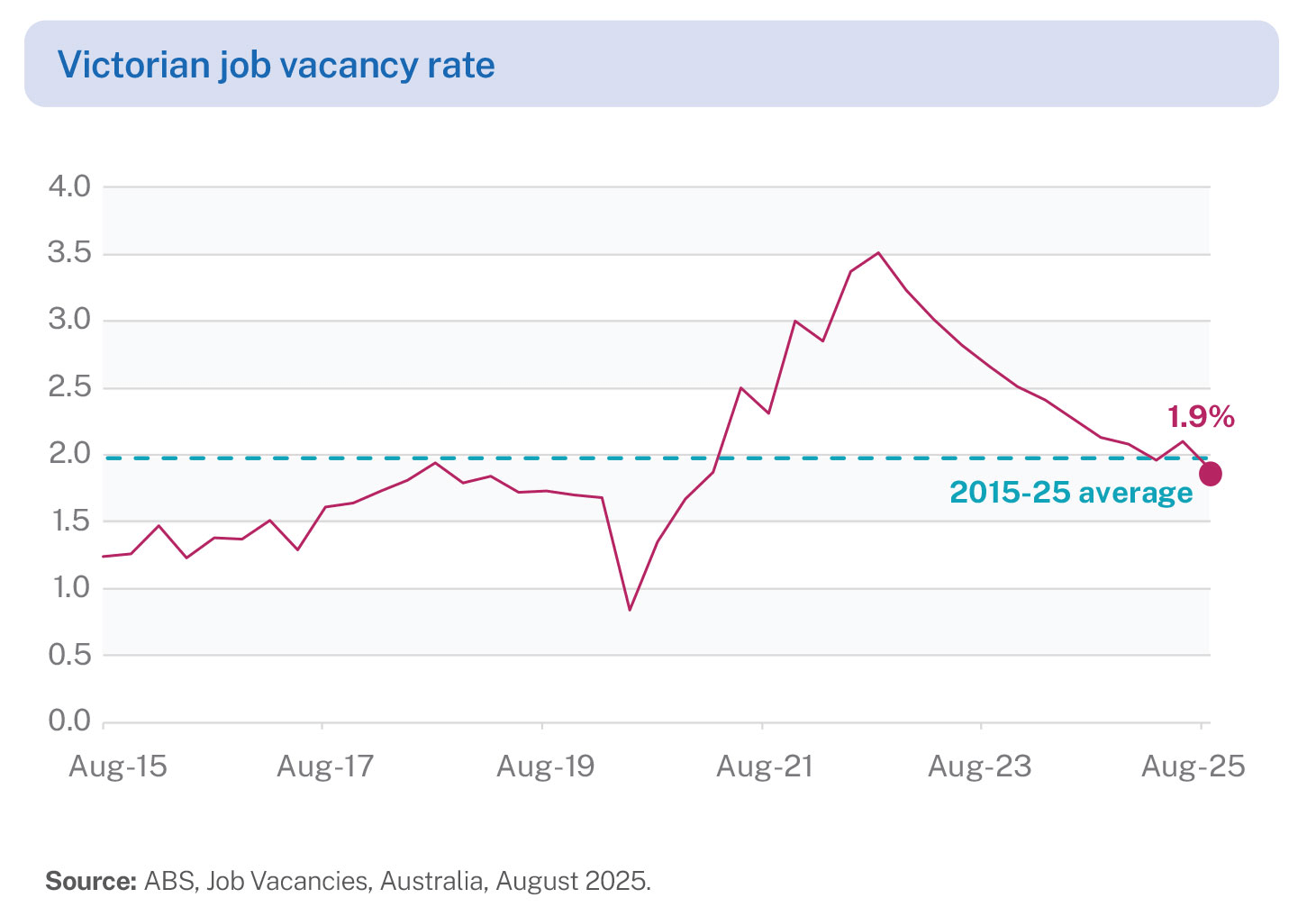 of 3.5% in August 2022 to 1.9% in August 2025. - There were around 74,800 job vacancies in Victoria in August 2025, compared to 126,600 job vacancies in August 2022.